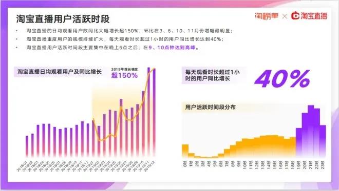 《報(bào)告》顯示,淘寶直播的日均觀看用戶數(shù)同比大幅增長超150%,環(huán)比在3、6、10、11月份增幅最明顯;淘寶直播重度用戶的規(guī)模持續(xù)擴(kuò)大,每天觀看時(shí)長超過1小時(shí)的用戶同比增長達(dá)到40%。