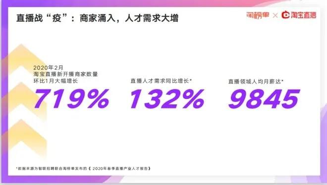 智聯(lián)招聘聯(lián)合淘榜單發(fā)布的《2020年春季直播產(chǎn)業(yè)人才報(bào)告》顯示,2020年2月淘寶直播新開播商家數(shù)量環(huán)比1月大幅增長,達(dá)到719%;直播人才需求同比增長132%,直播領(lǐng)域人均月薪達(dá)9845元。