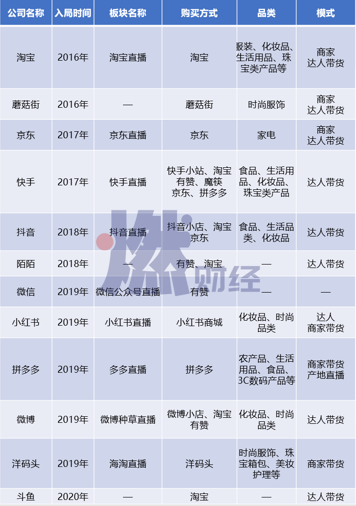 老牌玩家競爭激烈,新的玩家還在陸續(xù)涌入。燃財經(jīng)根據(jù)公開信息,整理出一份入局直播電商的不完全名單。